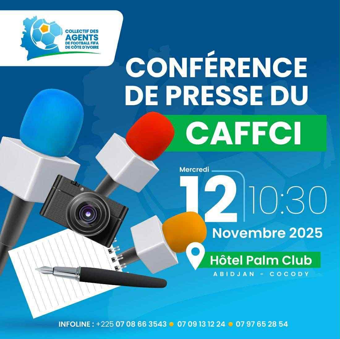 Ce mercredi 12 novembre 2025, le Collectif des Agents de Football FIFA de Côte d’Ivoire (CAFF-CI) convie la presse nationale et internationale à une importante conférence de presse à l’Hôtel Palm Club d’Abidjan, dès 10h30.