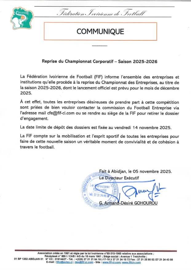 Une dynamique saluée par Albert ZbilLy, président de la Fédération Internationale de Football Corporatif, venu lui-même en Côte d’Ivoire en janvier dernier pour encourager les efforts de structuration du football d’entreprise local.