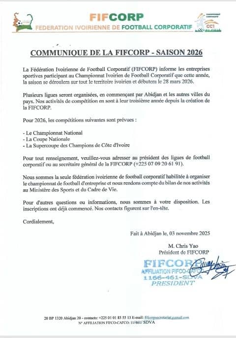 D’ailleurs, au titre de la saison 2026, ce sont trois grosses activités qui vont meubler le monde du football corporatif: le championnat national, la Coupe Nationale et la Supercoupe des Champions de Côte d’Ivoire.