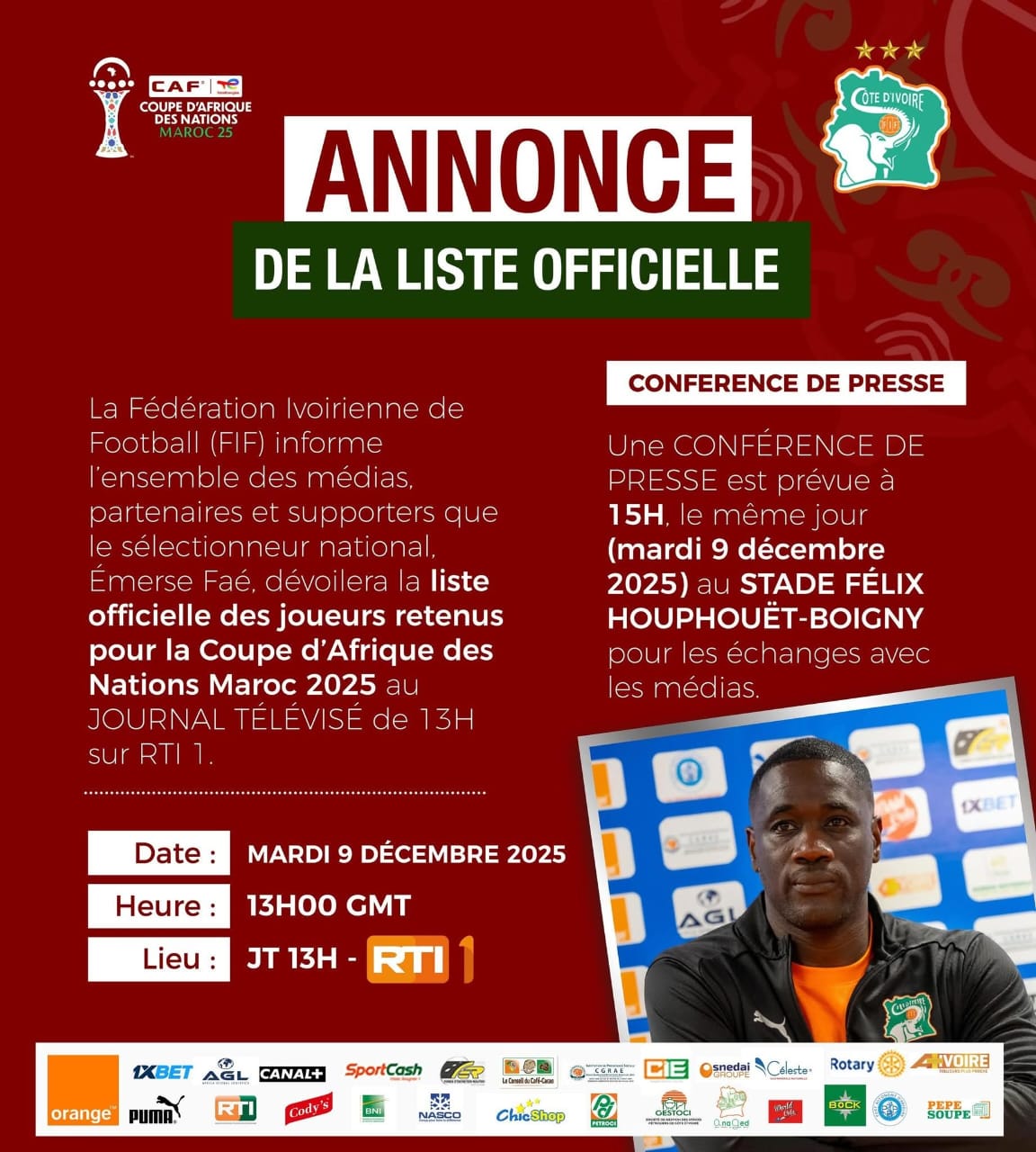 L’attente prend fin ! Ce mardi 9 décembre, le sélectionneur national Emerse Faé dévoilera enfin la liste des joueurs retenus pour défendre les couleurs de la Côte d’Ivoire lors de la 35ᵉ édition de la Coupe d’Afrique des Nations, prévue au Maroc en 2025.