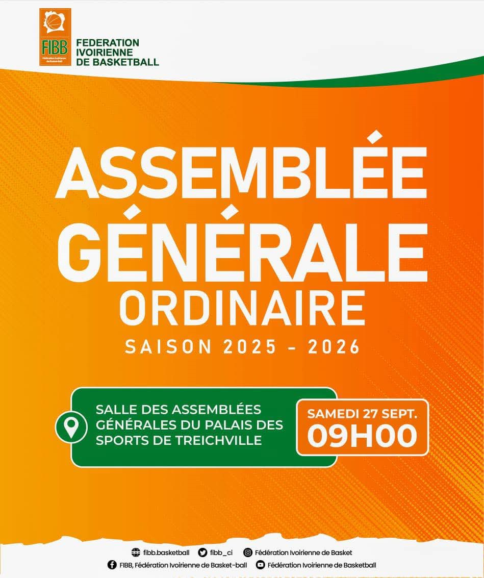 Ce samedi 27 septembre 2025, au Palais des Sports de Treichville (salle des AG), la FIBB tiendra son Assemblée Générale Ordinaire dès 9h GMT. Une occasion pour l’exécutif fédéral de présenter à la famille du basket son programme d’activités 2025-2026, son budget de saison ainsi que le plan de développement de la DTN pour les deux années à venir.