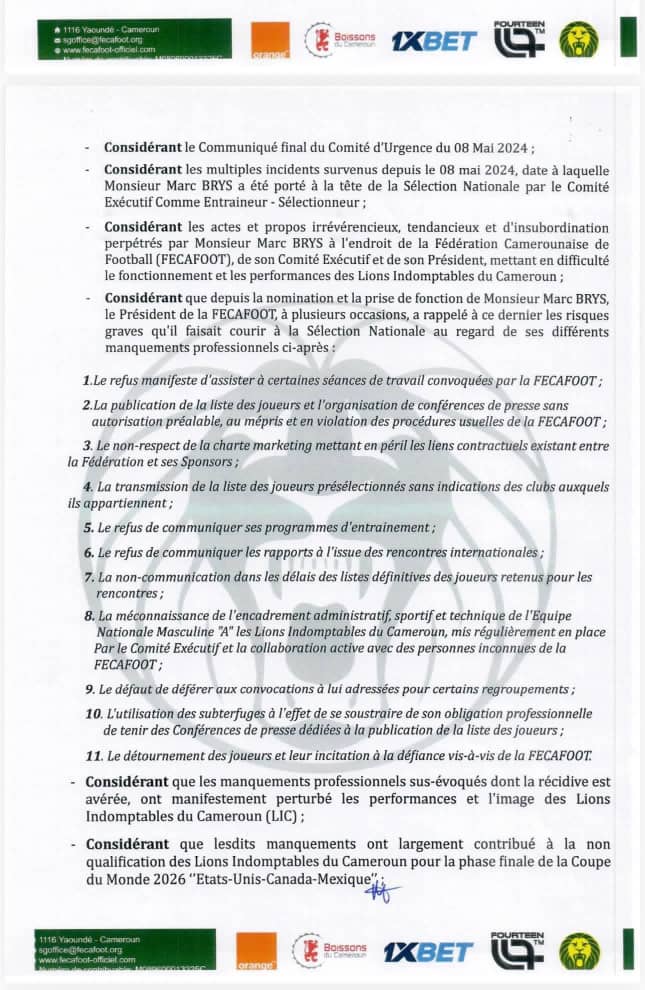 Officiellement, Marc Brys est évincé en raison d’un affrontement public jugé inacceptable avec le président de la fédération. Une réunion de crise aurait fait exploser les tensions, poussant la Fecafoot à trancher net.