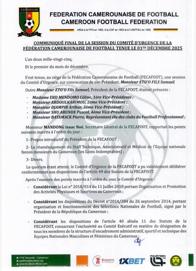 Cette restructuration express illustre la détermination du président de la Fecafoot à installer un fonctionnement qu’il contrôle totalement.