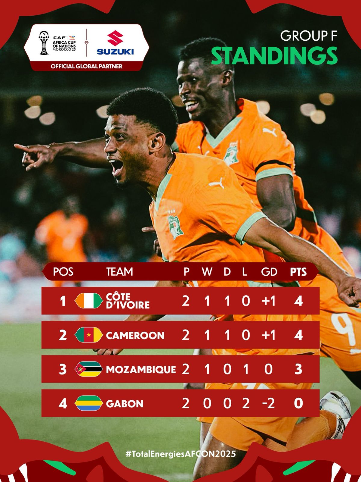 👉 Résultat : le Gabon est déjà au bord de l’élimination, et le Mozambique devient l’arbitre du groupe F.