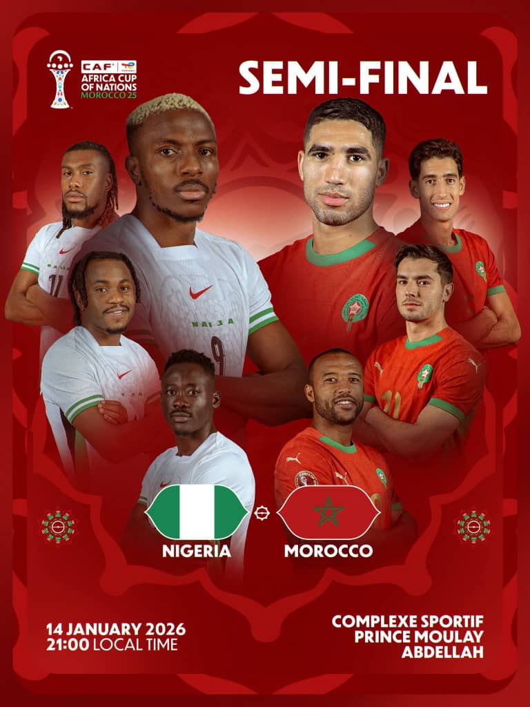 La TotalEnergies CAF Coupe d’Afrique des Nations Maroc 2025 entre dans sa phase décisive ce mercredi 14 janvier avec une affiche de prestige en demi-finale : le Maroc, pays hôte, face au Nigeria, triple champion d’Afrique, au Stade Prince Moulay Abdellah de Rabat à 20h00 GMT (21h00 locale).