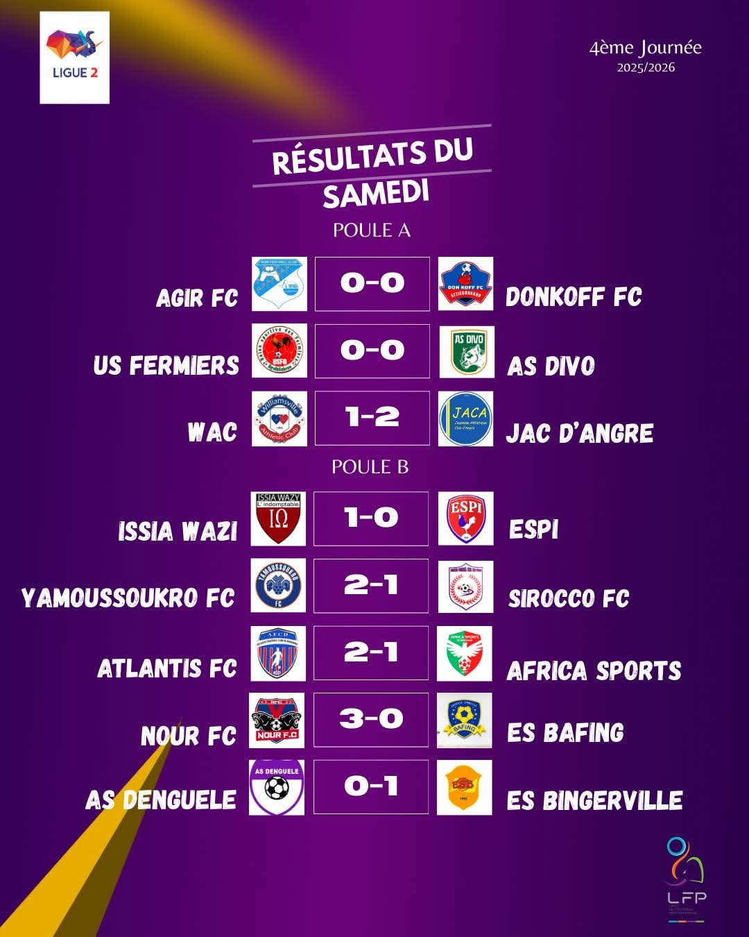 À noter les victoires des 3 promus: ATLANTIS FC, NOUR FC et JAC D’ANGRÉ sur des cadors de la Ligue2.