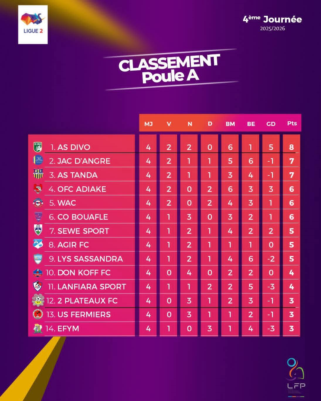 Après quatre journées, l’AS Divo domine la poule A de la ligue 2 devant les cadors, Lys Sassandra, Sewe Sport et CO Bouaflé.