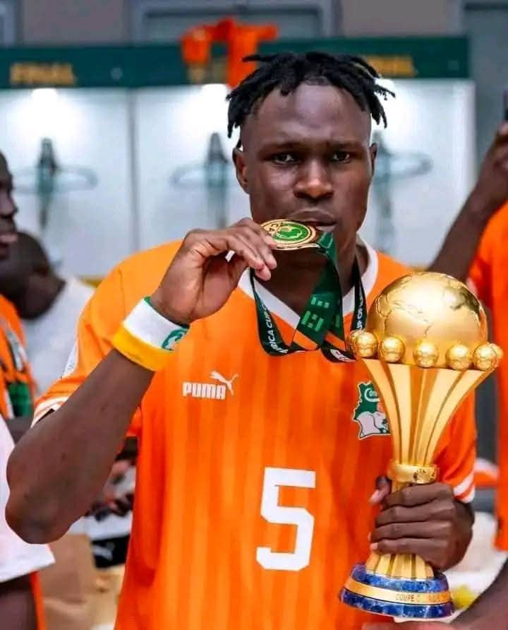 (Photo d’archive, Wilfried Singo avec le trophée de la CAN 2023 et sa médaille d’or)